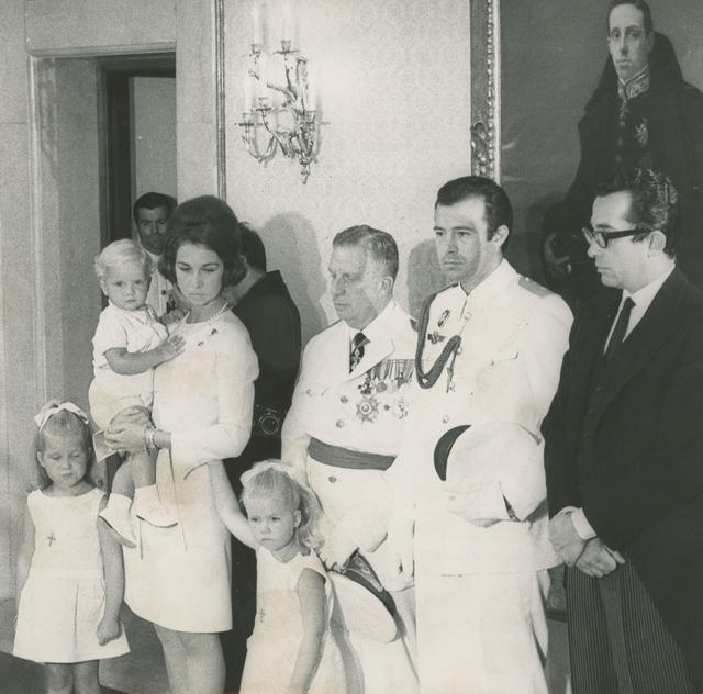 Instantánea de doña Sofia, sus hijos y Alfonso de Borbón mientras presencian en el Palacio de la Zarzuela la aceptación de Juan Carlos de Borbón como sucesor de Franco a título de rey