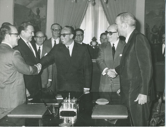 Fernando María Castiella, Ministro de Asuntos Exteriores; Vicente Urcuyo, Embajador de Nicaragua; Jesús Romeo Gorria, Ministro de Trabajo; y Navarro Richardson, Ministro de Trabajo de Nicaragua