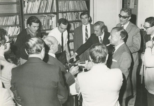 José Carlos González-Campo Dal-Re, Cónsul General de España en Toulouse, departe con los emigrantes españoles, miembros del Centro Español de Toulouse, después de hacer entrega de más de 300 volúmenes ofrecidos por el Instituto Español de Emigración y el Ministerio de Cultura y Ciencia