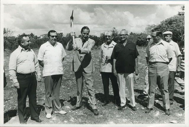 El Embajador de España en la República Dominicana, don Aurelio del Valls Carreras, da el primer picazo para iniciar la construcción del nuevo local de la Casa de España en Santo Domingo. El acto tuvo efecto el 21 de enero, fecha em la cual se celebra en la República Dominicana la festividad de Nuestra Señora de la Altagracia, Madre Espiritual del pueblo dominicano. En la foto, el presidente de la Casa de España, Don Juan García Mompó y miembros de la directiva.