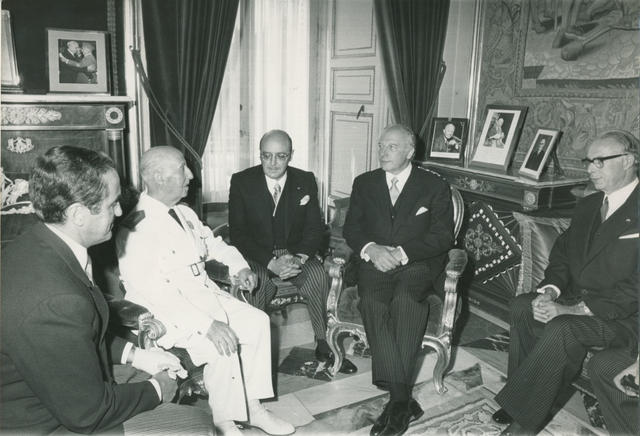 El Jefe dde Estado recibe en audiencia en el Palacio de El Pardo al ministro de Asuntos Exteriores de Alemania Federal, Walter Shell, en presencia del Ministro de Asuntos Exteriores español, López Bravo, y el Embajador de Alemania en Madrid