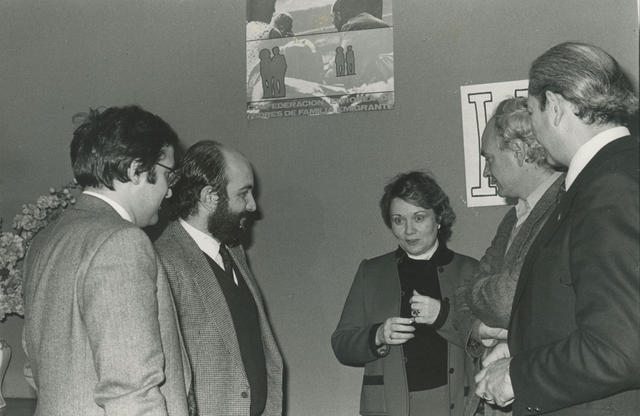 Javier Casas (Subdirector de Emigración del IEE), María Teresa Iza Echave (Directora General del IEE), Joaquín Almunia (Ministro de Trabajo y Seguridad Social) e Ignacio Ruiz (Presidente de la Confederación Europea de Padres de Familia)