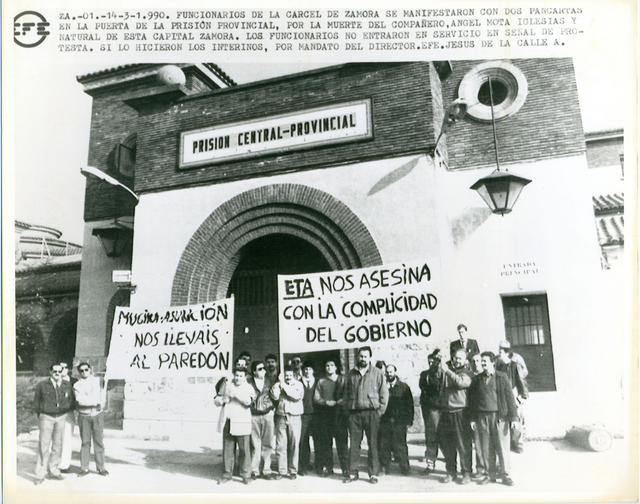 Funcionarios de la cárcel de Zamora se manifstaron con dos pancartas en la puerta de la prisión provincial, por la muerte del compañero Ángel Mota Iglesias